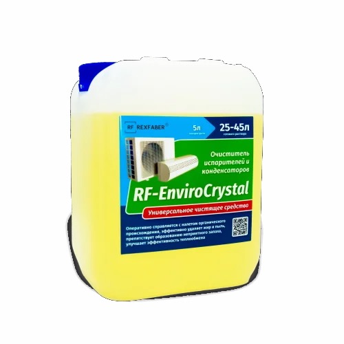 RF‑EnviroCrystal – готовый к применению малопенный очиститель от REXFABER на щелочной основе с коррозионным ингибитором. Эффективно удаляет органические отложения, жир, пыль и предотвращает неприятные запахи. Улучшает теплообмен и защищает алюминиевые поверхности испарителей и конденсаторов